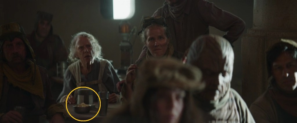 While giving The Mandalorian’s season two opener a rewatch I noticed something in the scene where we are first introduced to the Marshal ‘Cobb Vance’. When Vance removes his helmet and sits down, he places the helmet on the table next to a particular style bowl. I probably wouldn’t have noticed it until perhaps a fourth or fifth casual reskim of the episode, had Jon Favreau not lampshaded the helmet with a gratuitous closeup.