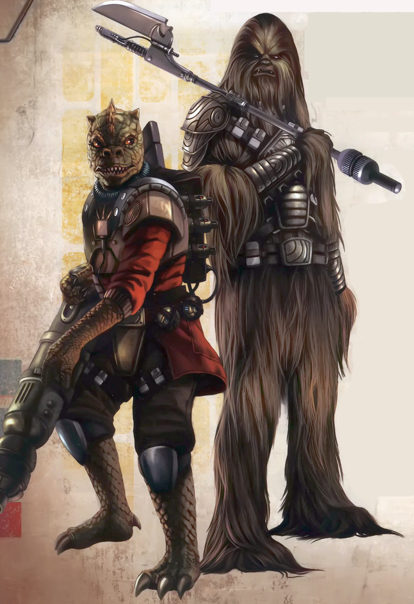 When primary sources fail, secondary sources are useful, especially role-playing materials which are great for giving an idea of what a generic character archetype might look like. Fantasy Flight Games’ Edge of the Empire game includes both ‘Big Game Hunter’ and ‘Bounty Hunter’ as character classes (with Martial Artist, Operator, and Skip Tracer specialties), as well as related mercenary classes like Hired Gun and Heavy. Note again, the no-nonsense character designs free from clutter. I even combed through FFG’s dedicated bounty hunter sourcebook and found no examples of hunters encumbered by mementos of past hunts.