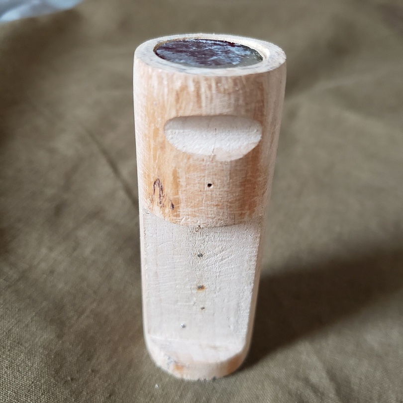 My options for adding weight to the pistol’s body was either poured lead or round balls;. my handy-dandy lead weight calculator showed me that a 3x½” cylinder would weigh .4 oz more than 3 inches of .595 balls, so I drilled a ½” cavity into the upper dowel, heated up my new Hot Pot, and got to pouring: