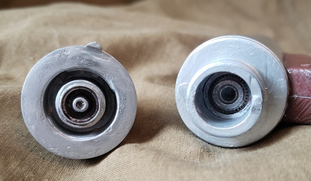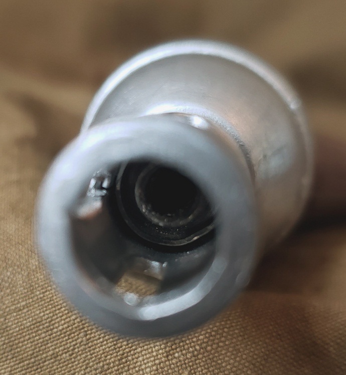 The internal chamber (visible underneath the screw-on butt cap) would definitely need some spicing up to sell the illusion of an actual blaster pistol. I played with a couple of ideas, but eventually shortened the inner battery chamber with the backside of a model Corvette hubcap serving as the Heter valve, which mated perfectly with a Corvette wheel in the butt cap to deliver the Tibanna gas. Since (per RPG details) the gas cartridges were essentially disposable, I originally wanted the butt cap internals to look shiny and new and the valve inside the receiver to look slightly worn (I figure Tibanna gas is a little corrosive?) but my brushed paintjob didn’t quite pull it off. Down the line I may try some more metallic spraypaint on the underside, but for now a light brownwash looks good. Inside the muzzle, a piece from a mini Maglite(?) became a nice ‘emitter’: