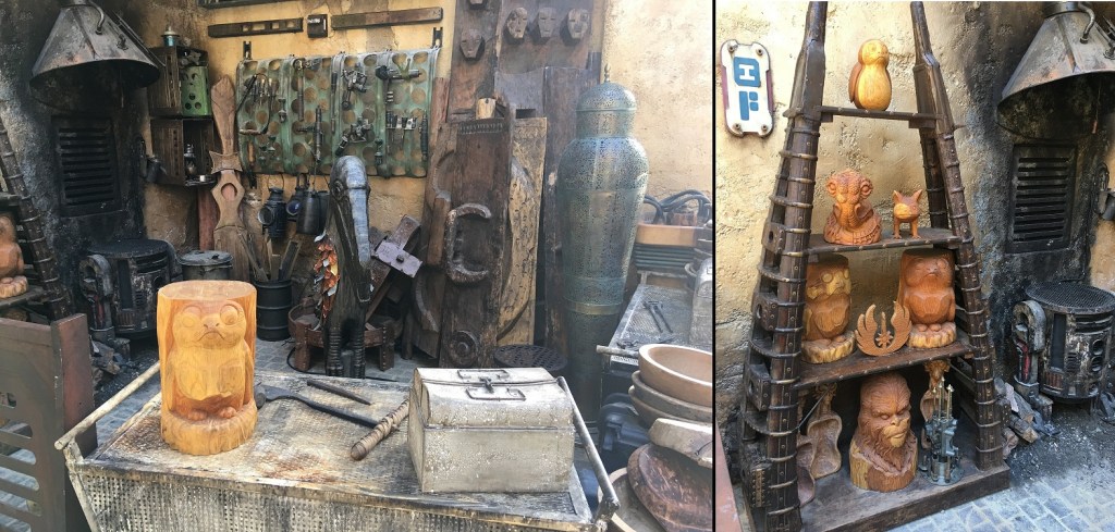 Seriously, if there’s one thing Galaxy’s Edge needs, it’s interpreters to enliven the place…it’d be one thing for this area to be covered in unswept woodchips (as if the craftsman had just stepped out a moment before), but how much cooler would it be if someone were actually behind the workbench with chisel and mallet in hand? As it is currently, it just adds to the soulless-but-meticulously-set-dressed feeling of GE. 😦