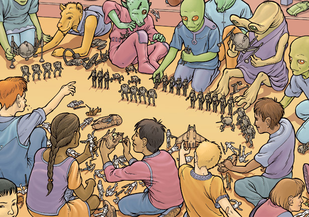 Jorin Sol (from Dark Horse’s Empire and Rebellion series) is seen here as a child. Since he was presumably born during or just after the Clone Wars and is perhaps 10 or 11 here, it seems this type of contrasting collar decoration (see the playtime image below) stuck around for a number of years.