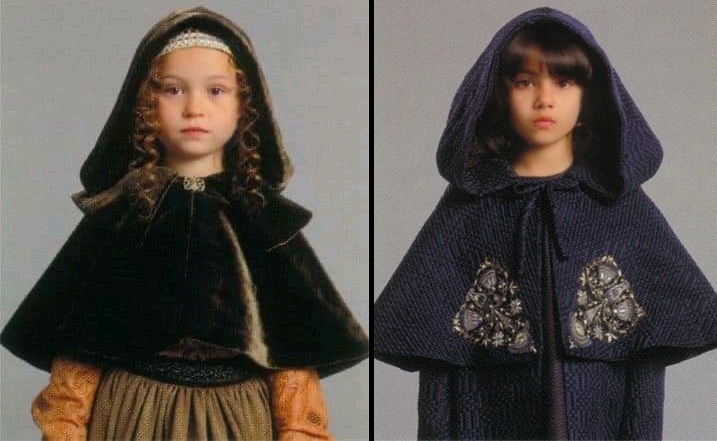 When their aunt dies, the girls don more formal hooded capes for the occasion. I wonder if Pooja’s under-cape outfit is Ryoo’s Episode II outfit as a hand-me-down? The colors and skirt pleats look similar: