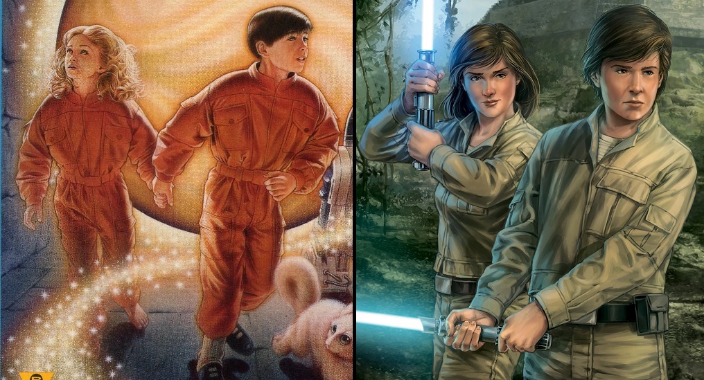 The kids from the Galaxy of Fear series (aka Star Wars does Goosebumps!) are pretty consistently depicted on the covers as wearing cream jumpsuits, with or without pockets (no layering, surprisingly).