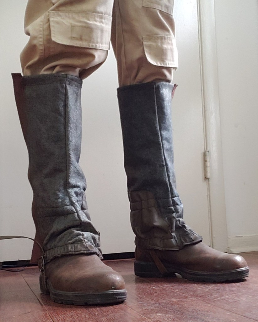 As with the satchel, the solution to the issue here was simple: another length of brown cotton webbing (1 inch wide this time) sewed onto the front section to cover the zipper. However, I also wanted to tailor the gaiters as well. This was not as straightforward, but I persevered. I removed the ankle elastic from the center front and rear (to free up material), sewed a 3/8″ tapered seam down the center front (to better mimic the curve of my shin), removed the rear half of the zipper, cut out about two and a half inches of material, rehemmed the top drawstring area, double- and triple-checked the fit with the zipper, and sewed everything together. There was a lot of trial and error on the first gaiter, but by the second one I knew what to do and got it banged out in half the time. I also darkened the shiny rivets with some acrylic and Modge Podge. The effort, I’m happy to say, paid off, and the overall look is much improved: