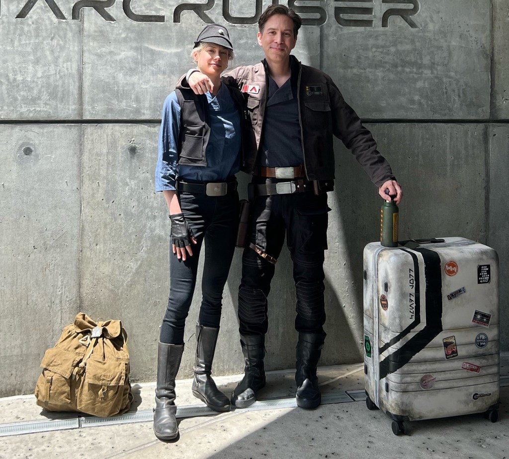 Max reports that his initial inspiration for his character design was—as it is for so many, because the look is just so sweet—the iconic Han Solo style. He already had a bunch of Han-related pieces but didn’t want to just “go as Han Solo”, because any use of those elements (shirt, pants, vest or jacket) would immediately be identifiable. Instead, Max decided to come up with his own costume design, and because the Galactic Starcruiser experience is set during the ‘Sequel Trilogy, he focused by looking at costume designs from those movies.