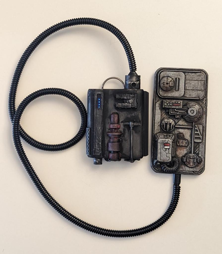 Since much of the Starcruiser experience relies on the ‘datapad’ to accept missions and build rapport, Max anticipated being on his phone a lot. In order to stay fully charged, he commissioned an in-universe-styled ‘costume’ for a small power bank: a very cool prop that performs its function without breaking immersion!