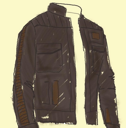 The jacket was custom made from Max’s design by a professional costumer friend. He says it was originally meant to be a jacket that could be converted to a vest, but this proved problematic so it became two separate pieces, both made from waxed cotton. The jacket has ‘pilot-style’ box-pleated suede accents down the arm, and the vest is dressed up with accents like a leather yoke. Their belts were from Darman’s Props; one belt he already had from a ‘Poe Dameron’ costume, while the other belt was a blank, purchased with the pouches to match colors. Max’s boots are the licensed Finn/Poe boots from Po-Zu.