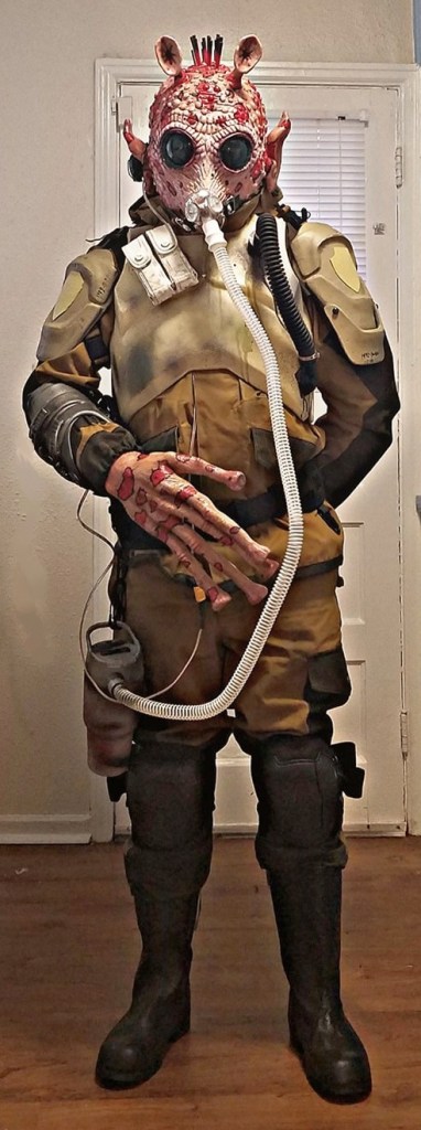 In terms of real-world functionality, Xetrax wears a Roamer-6 breath mask which is actually attached to a mini air-conditioning unit that feeds cold air into the mask! This is definitely a necessity when wearing a full-coverage mask like a Rodian. Sean reports that he feels pretty pleased with the ‘outer persona’ at present, so the upgrades he has planned for the future are all practical, focused on making the cooling mask more reliable and comfortable.
