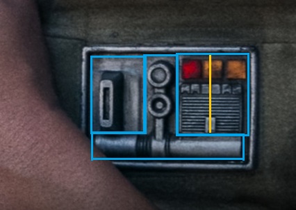 Speaking of aberrations, there’s this one worn by John Boyega’s “Finn” in Disney’s final, self-parodic Sequel. I waffled on whether or not to include it and finally decided that I should, because it’s a great example of the clear disconnect between the visuals of the modern properties and those produced under Lucas. Note it is all just a single color, has a weird empty space, tiny ‘transistors’, wires/’network’ connections, and a perforated ‘grill’ designed to accommodate the round component. Like I said – WEIRD.