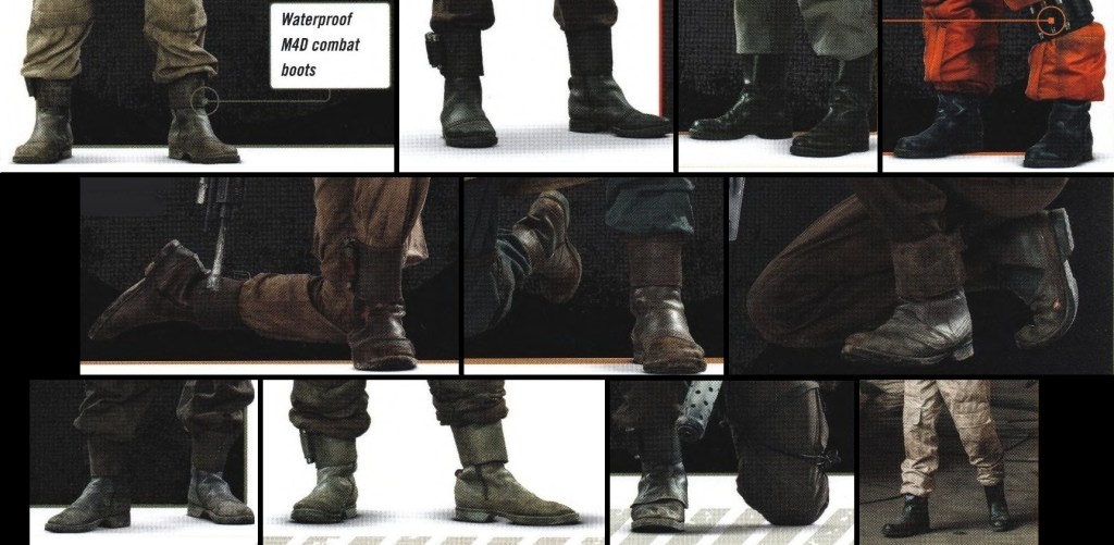 We’ll finish up with a look at one of Rogue One‘s curious deviations from the prior visual record. (I say curious because so much was made of the production design’s commitment to accurately recreating the style of Episode IV, and yet they put their pilots, ground crew, and commandos in a style of low combat boot (made by Frye, I believe) not seen anywhere in the Original Trilogy. I’m less concerned with the commandos as those are a character class not present in the original film.)