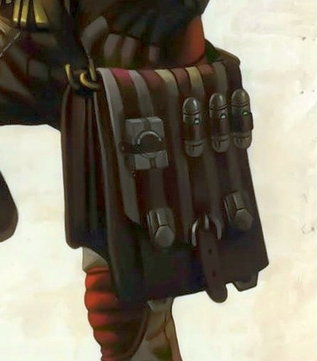 This low-slung example belongs to the archeologist character Levet in Fantasy Flight Games’ Edge of the Empire RPG (2013), and it is definitely the outlier among our sample set: a flap with contrasting striping, a half-dozen greeblies, and a visible earthly tongue-buckle. The stripes actually bother me more than the tech, but as we can see from the rest of our examples, simple is better.