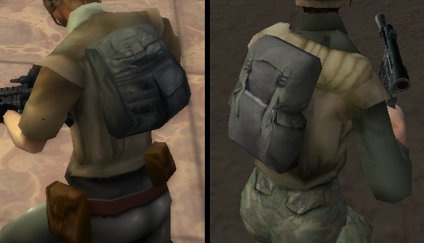 In the pre-EA Battlefront and Battlefront II (respectively), the Rebel snipers wear these small gray packs. If you squint, the BF1 iteration halfway resembles the Endor pack above, while the BF2’s twin rectangular layout is kind of reminiscent of the rigid two-box Rebel backpacks we looked at last month.