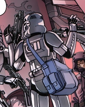 This TK’s ‘messenger bag’ (from Dark Horse’s Empire #39 (2006) is wonderfully nondescript. The tabbed flap pockets say ‘modern tactical’, and if this was an Earth bag it’d probably be constructed from black nylon, but instead it’s blue-gray like Luke’s pack above.