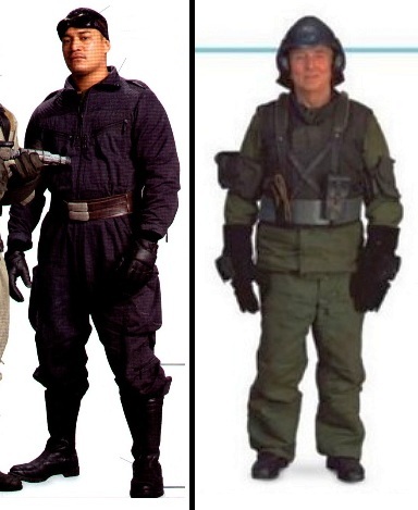 These guys are essentially dressed as the dark side version of the crews at Yavin (though it looks like they don’t even get belts?): ‘talker’-style helmet and a plain navy blue boiler suit; unknown if they blouse their pants or not, but it looks like not.