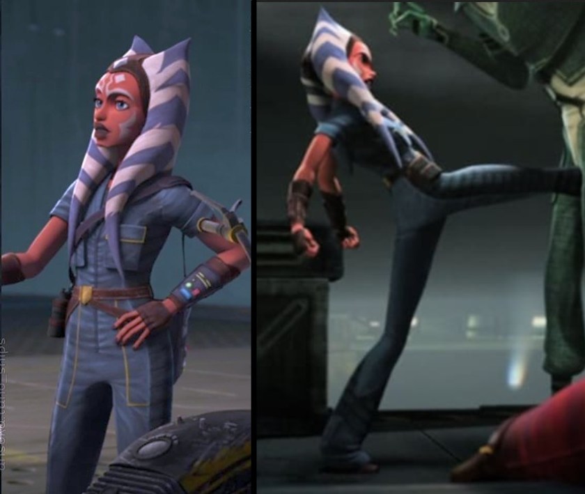 Okay, I know we’re limiting our sample to live-action, but I’m including this last one in this entry as it’s from animation and not just 2D print materials (that’s for next time!). I haven’t seen any of the later Clone Wars, but I kept seeing folks cosplaying as ‘mechanic Ahsoka Tano’, so I looked it up.