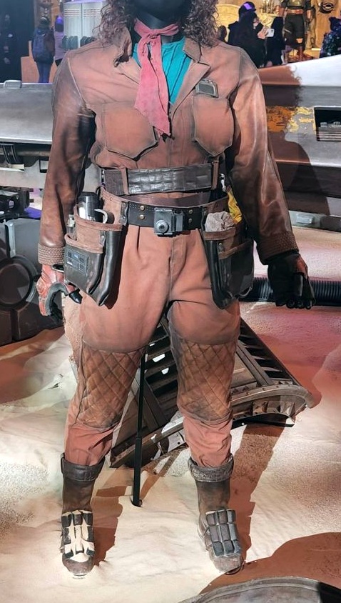 The background extras of Rogue One also include one ‘Gavra Ubrento’, said to be part of a roving band of mechanics; while she’s obviously wearing a one-piece coverall, it’s hard to tell what her footwear situation is, but her pants are definitely not baggy ‘Yavin-style’, and she might be wearing something like engineer boots. Her outfit includes a belt, printed details on the upper right front, and elasticated cuffs in a rare contrasting color, as well as a geometric design on the back: