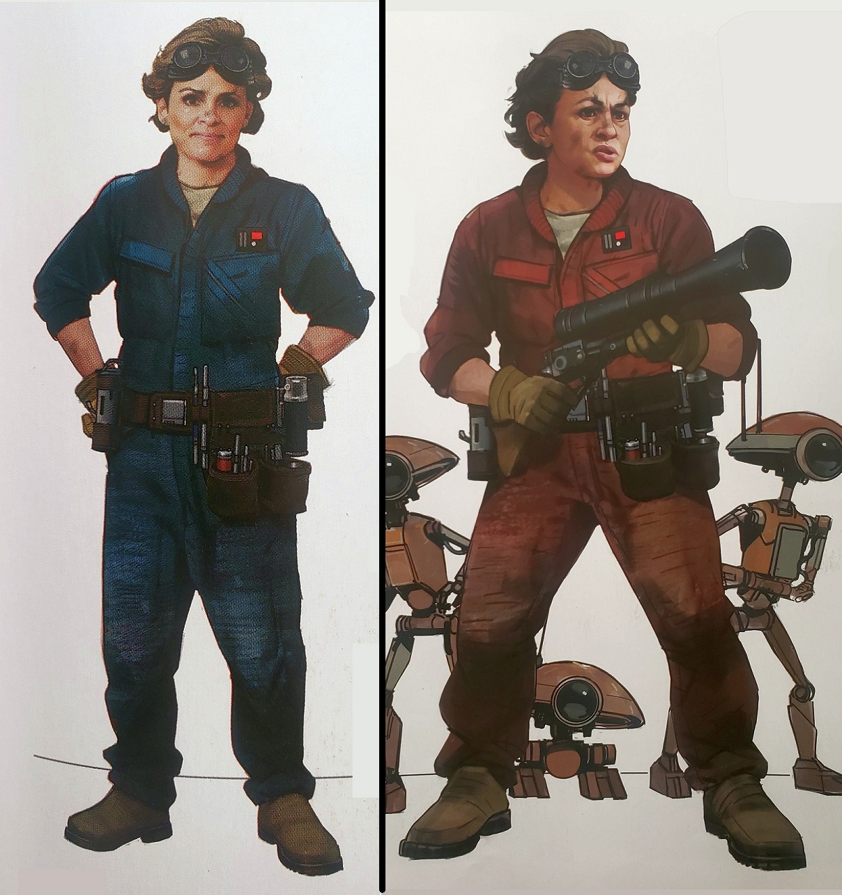 Up to this point, all the mechanics and technicians we’ve seen wearing coveralls have been wearing coveralls made of one material. Peli’s, on the other hand, pairs a fabric body with what appears to be leather sleeves, with tooled panels at the cuffs, collar, and shoulders, and asymmetric sleeve details. And a comm badge greeble. And a greeble on her tool pouch. And quilted knee reinforcements (those I don’t mind). And weird chunky armor things on the tops of her boots. I dunno, all I’m saying is: compared to what came before, it’s a weirdly over-designed character design; her concept art was much simpler and more in line with the prevailing style.