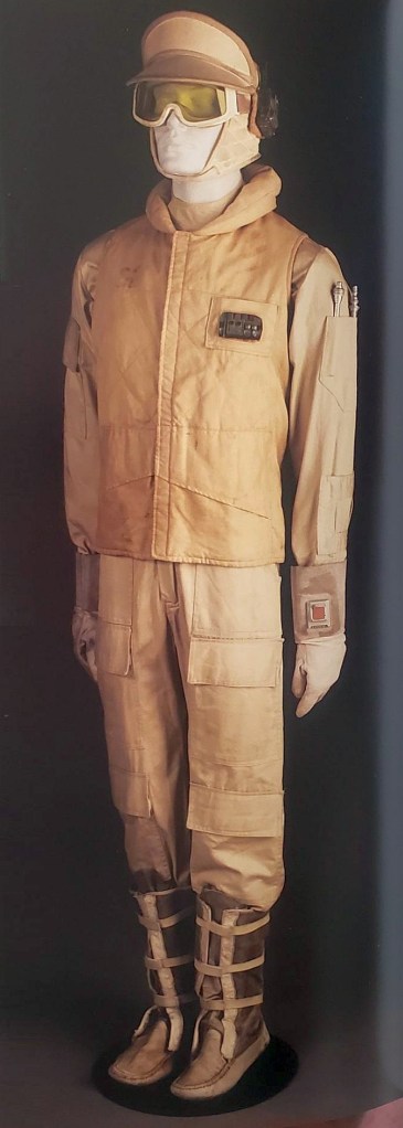 In the first act of Episode V, we see the Rebels still have need of technicians to work on their vehicles, but they’re sensibly dressed for the frigid temps of Echo Base, wearing the same tan coverall as at Yavin, but paired with a vest, mukluks, and an insulated hat: