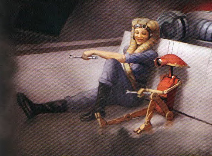 The vignette that opens Special Modifications (the Technician sourcebook) sees Twi’lek mechanic Chalan Talosi hanging with her pit droid, WAC-77. We can see she wears a gray or slate blue coverall with the sleeves and legs rolled up – normally if a tech is wearing tall boots, they’re visible because the pants are tucked/bloused, not rolled up, so this is certainly a choice…but hey, maybe it gives better ventilation or something? It could simply be a gathered waistband, but it does look like she’s wearing a belt. Also note the goggles (not currently in use), which are a prime accessory for any welding-related occupation!