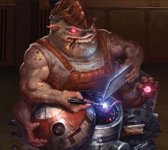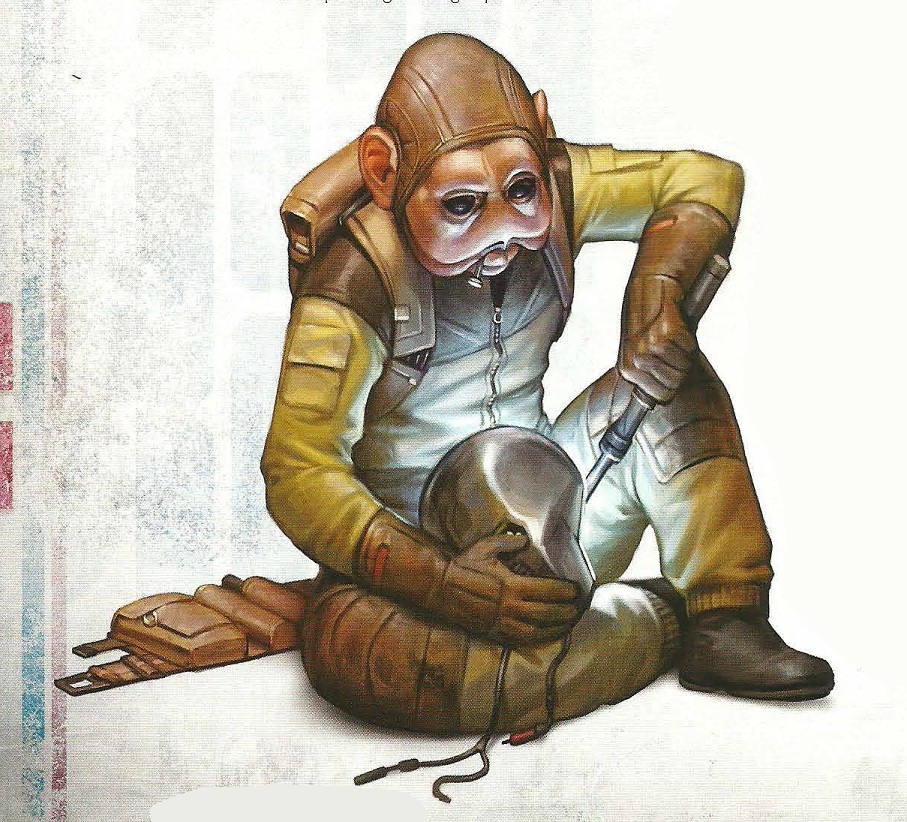 This last one dates way back to when Wizards of the Coast held the RPG license; unfortunately they didn’t really do occupation-specific sourcebooks like FFG does, but it’s quite clear that we’re seeing a droid technician at work. Though he wears a vest (something we surprisingly haven’t seen much of in our examples so far), the coveralls and tools (plus the whole ‘elbow deep in astromech guts’ situation) leave no doubt who he is!