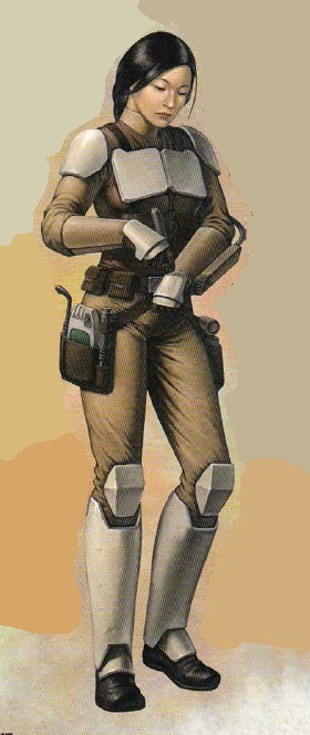 This next one also makes me wonder if it wasn’t originally just a standalone piece of artwork that got co-opted into the Technician book to fill space, because I hope you’ll notice her outfit includes something that none of our other examples really have. Armor! Honestly, the only things that really ‘read’ as mechanic/technician about her are her drab clothing (matching top & bottom) and her tool belt – aside from that, I would just as soon assume she’s some flavor of unhelmeted trooper. There’s an important lesson in here that I wish more OC cosplayers considered: while a good GFFA costume/character design uses a combination of ‘soft’ and ‘hard’ pieces (more on that later), when the hard parts start to outnumber the soft, the conclusion drawn by the viewer is ‘combat-oriented’. If your days are spent repairing droids, blasters, or other hardware, there’s no need for armor!