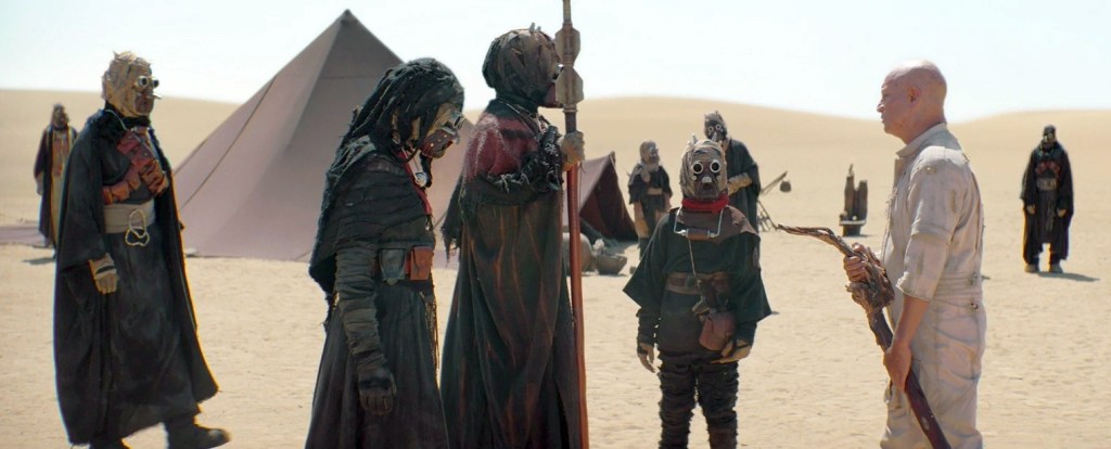 What’s more, Tatooine (where I understand Boba’s solo show was anchored) is the last place you’d want to be wearing black! While it’s not quite true that nobody wears black there, those who do (folks like Bib Fortuna or Garindan), are—wait for it—bad guys! They also happen to be hanging around indoors or in the city, not walking around in the open desert…but look, Boba’s show apparently introduced these variant Tuskens who wear tons of black out. in. the. open. desert.