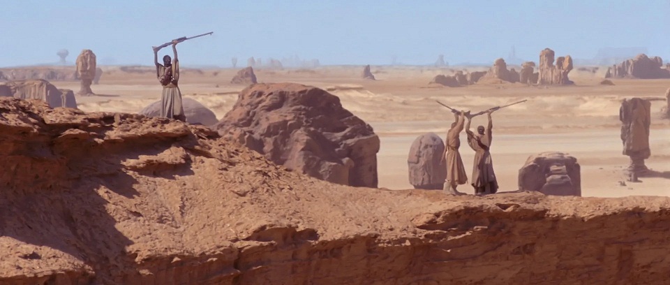 Making the Tusken group visually distinct has a purpose, but it could have been accomplished by use of color accessories or accents. Or if they wanted to use black, to have the clothing be less form-fitting. In a desert environment, loose and flowy is the way to go.