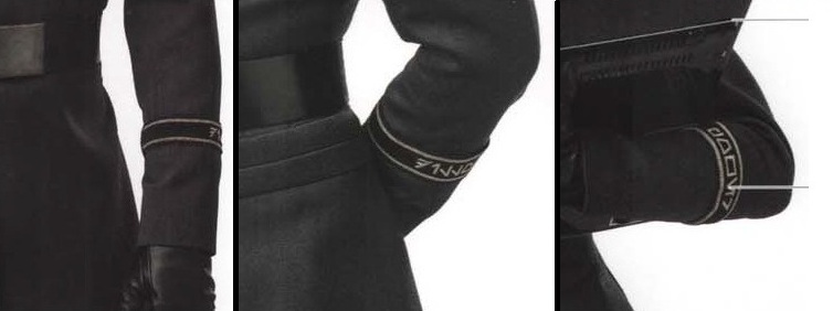 As you can see above, one of the key visual differences between the Empire of the OT and these new ‘First Order’ sequel baddies is the lack of OT-style rank plaques with the latter; the sequel visual dictionaries can’t decide if their ranks are shown by the tube-things in their chest-loops, or by these wristbands that say things like ‘Tarkin’, ‘Dillon’, and ‘Power’ or whatever (high-ranking evil characters I guess?) – just like WW2-era German forces had commemorative wrist cuffs with the names of uncle Adolf or Goring or whomever.