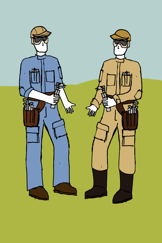 –As we’ve seen, mechanics & technicians typically wear a one-piece coverall (creating a cohesive look where the top and bottom half match) with or without the pants tucked into boots. Toolbelts are a necessity!
