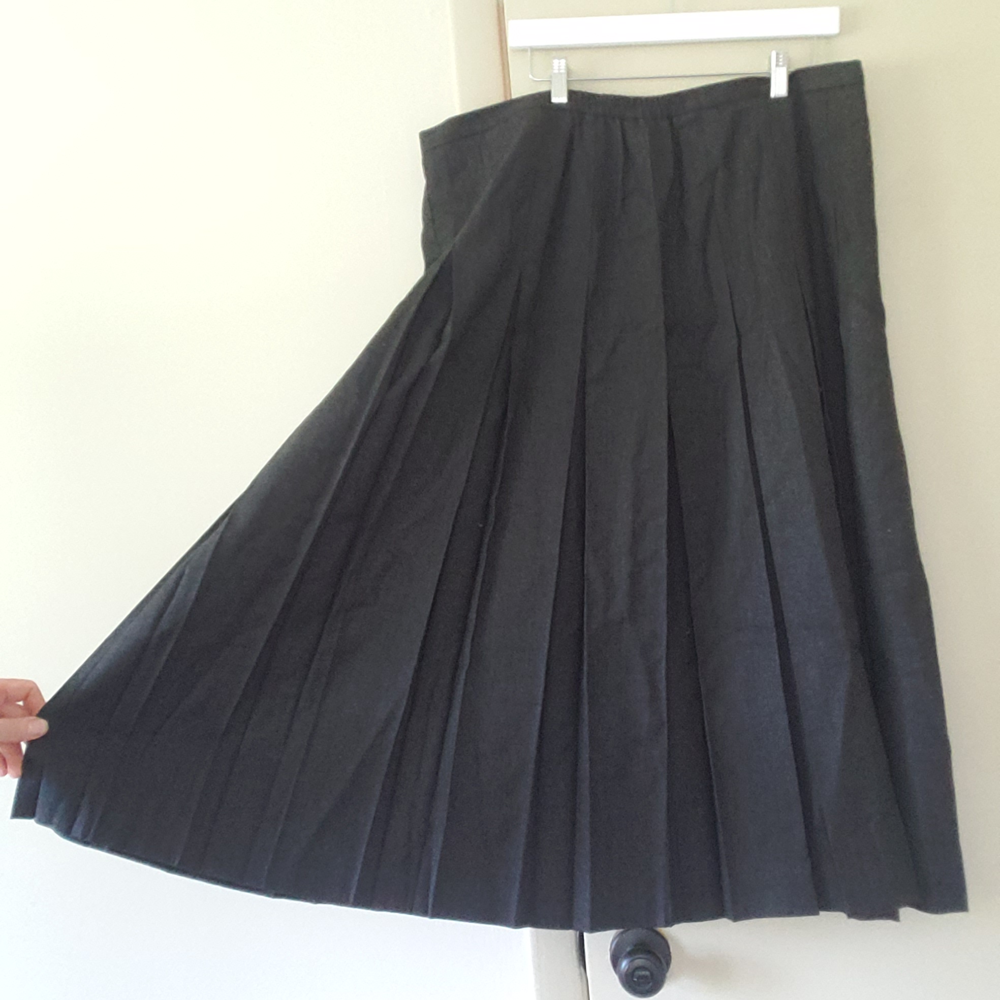 This 100% wool skirt illustrates a key pro tip: when it comes to skirts and dresses, plus sizes and pleats are your friends! – after all, pleats are just a way to pack more material into a smaller area! In this case, the skirt had a 40 inch waistband but thanks to being fully box-pleated, the skirt itself yielded over nine FEET of lush charcoal-gray material, the equivalent of two cut yards. At regular prices, this amount of wool might cost you 40 or 50 dollars, but this skirt was only $6.99!