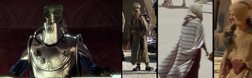 Conversely from refugees, the other segment of galactic society for whom patterns (from the massive to the tiny) seem to be more common is that of the upstrata. Here we have junior Representative Binks, Senator Ivor Drake, an unnamed Alderaanian Senator (32BBY), and actor/businessman Romeo Treblanc. Drake’s cloak-robe-mantle thing almost reads as camouflage, but if we had higher rez, I expect we’d probably find that it’s embroidery.