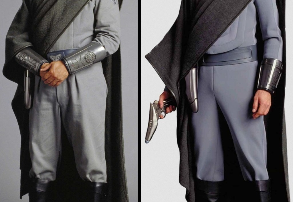 We also have a number of examples of blended fabrics, such as young Anakin’s tunic (silk/linen/hemp); Qui-Gon’s poncho (silk/linen); Darth Maul’s cloak (ditto); Han’s Endor duster (linen/polyester); Lando/Madine/Rebel generals shirt (and probably vest too – cotton/poly); Han’s EpIV shirt (Viyella – 55/45% merino wool/cotton); Hans’s EpV jacket (wool/cotton). Palpatine’s various Prequel robes (not pictured) were also made using a variety of silk/linen/wool velvets. It’s also quite likely that the many Imperial and Rebel jumpsuits made by Costas were a blend of cotton and nylon or poly.