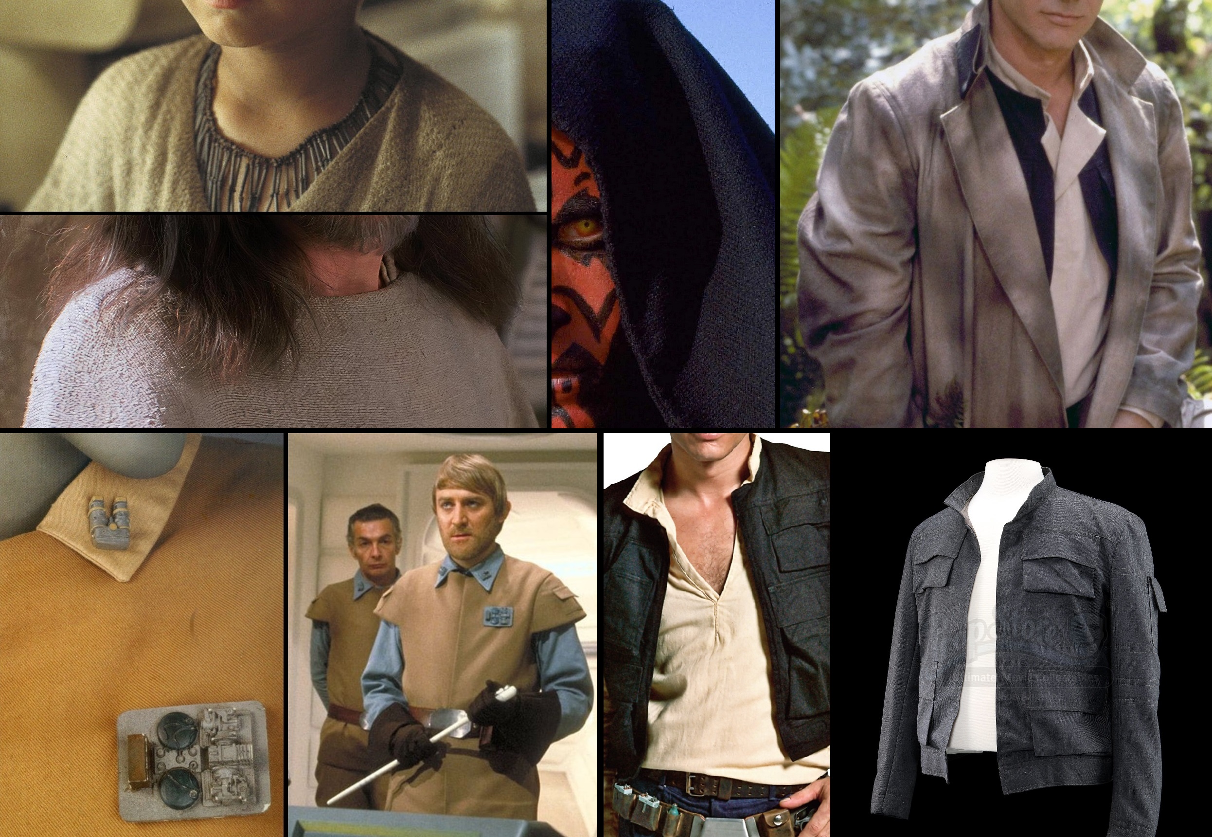 We also have a number of examples of blended fabrics, such as young Anakin’s tunic (silk/linen/hemp); Qui-Gon’s poncho (silk/linen); Darth Maul’s cloak (ditto); Han’s Endor duster (linen/polyester); Lando/Madine/Rebel generals shirt (and probably vest too – cotton/poly); Han’s EpIV shirt (Viyella – 55/45% merino wool/cotton); Hans’s EpV jacket (wool/cotton). Palpatine’s various Prequel robes (not pictured) were also made using a variety of silk/linen/wool velvets. It’s also quite likely that the many Imperial and Rebel jumpsuits made by Costas were a blend of cotton and nylon or poly.