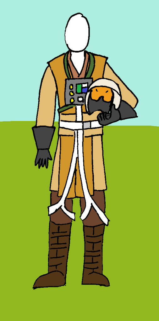 The snubfighter pilot class of the GFFA is primarily inspired by the looks of military pilots of the Second World War: one-piece flying suits (heavily pocketed!), parachute/ejection harnesses, cloth flight caps, oxygen masks/tubing/life support boxes, etc….plus postwar flight helmets. This is at odds with the cozy robes and tunics of the Force-user, who are fairly unadorned as befits an order of space-monks. In fact, Jedi don’t even have pockets!, thus they can’t slouch around with their hands in them, and are forced to do different things with their hands. (Now there’s a bit of homework for you – go rewatch a Star War and only pay attention to characters’ hands!) However, as we can see above, the no-nonsense style of a military pilot clashes if paired with the ostentatious trappings of the galactic upstrata.