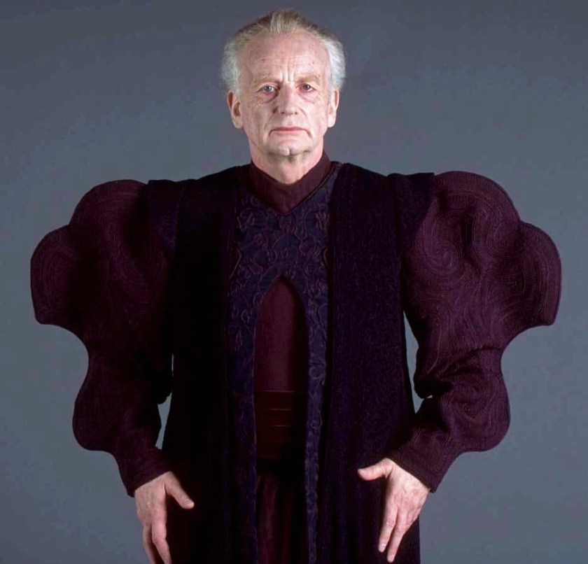 Or take Palpatine’s “I love democracy” outfit from Episode II – you know, the one with THE SLEEVES: