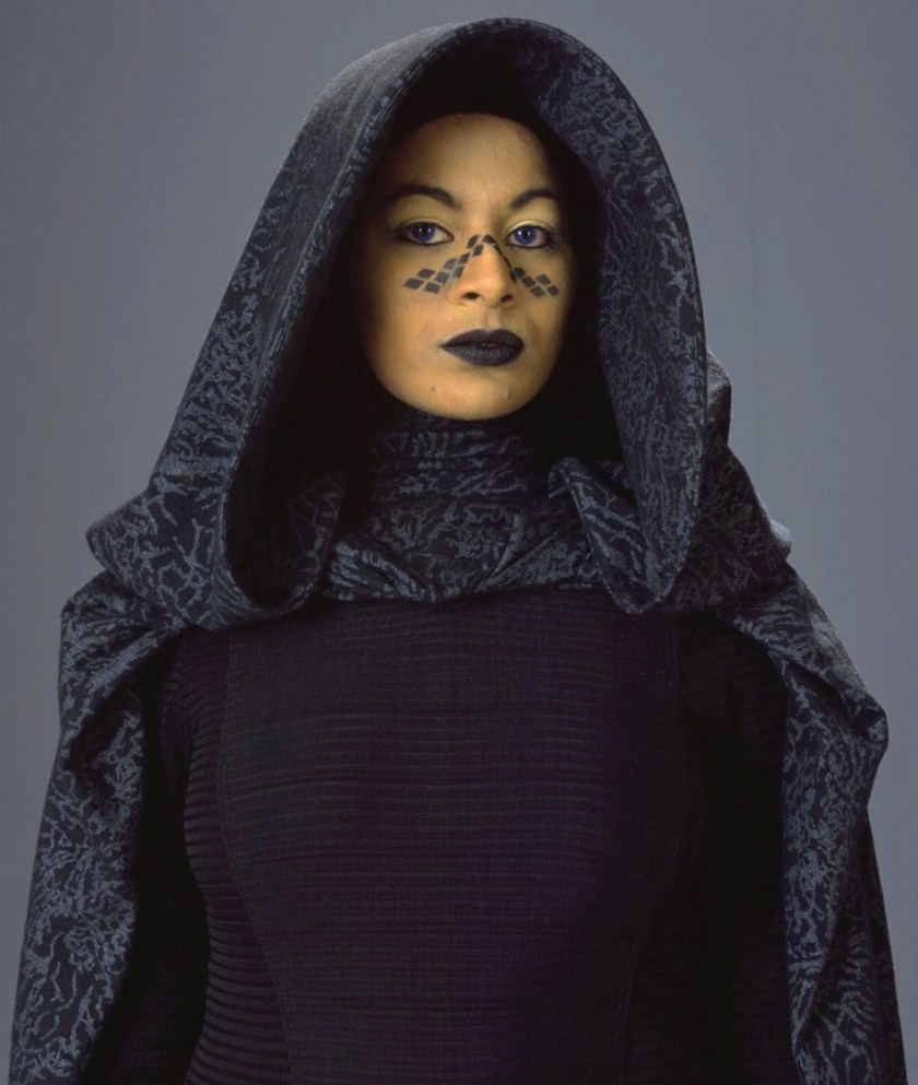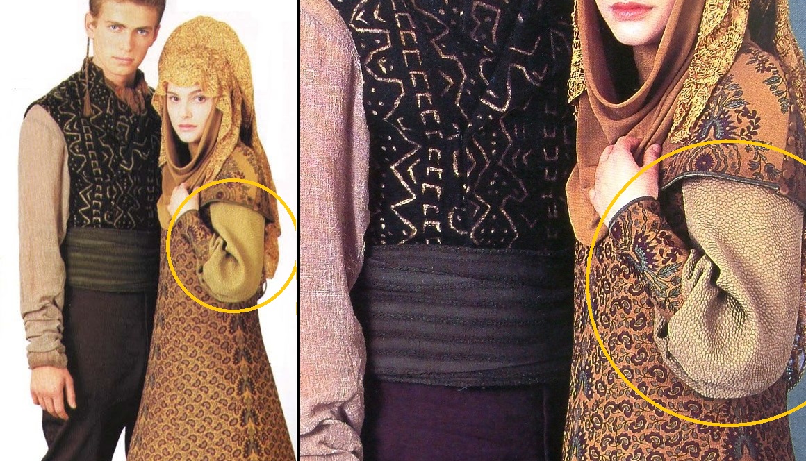 However, even at a distance, our eyes will still subconsciously pick up on a good texture to tell our brains that the material is substantial. Case in point: Padme’s refugee disguise sleeves – up close, they look more like, I dunno, pebbled lizard leather?!, while from a distance they’re simply ‘interesting clothing with good drape’: