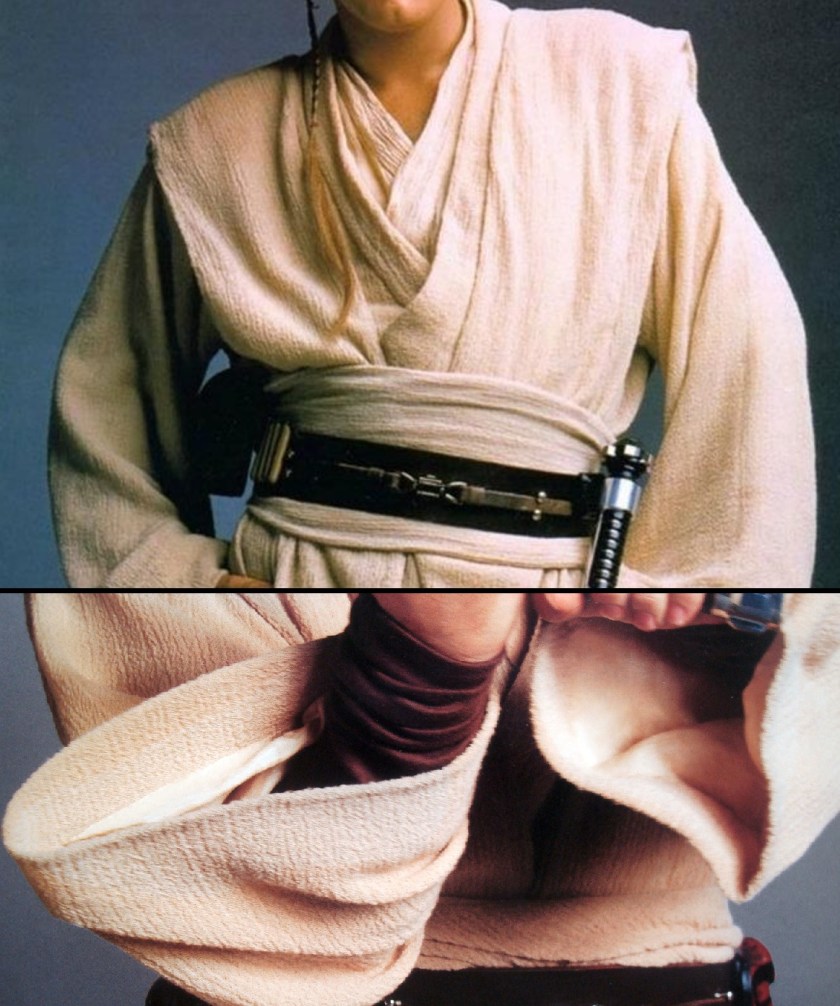 Another fabric available ‘off-the-bolt’ is ‘crinkle cotton‘, used extensively in the Prequels for various Jedi tunics. The material itself is very thin, so it’s best used in two layers (or paired with another lining material) to give it some drape and weight.