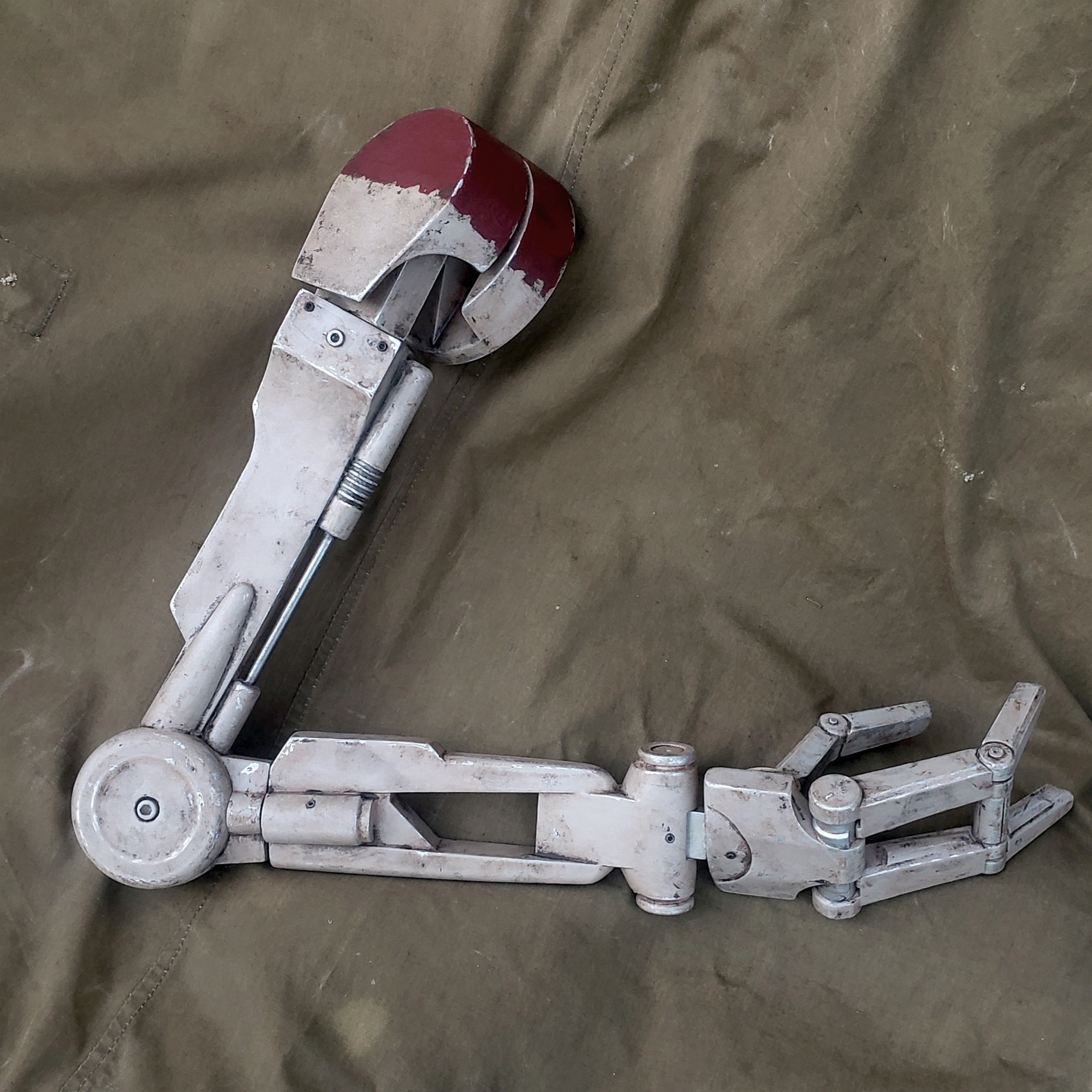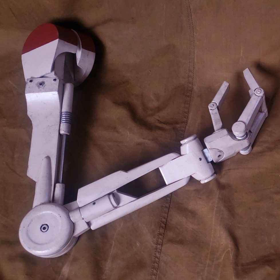 It’s back! Credit for this renovation goes to eagle-eyed site reader S.C., whose critique (back in October 2020 when I first unveiled this project!) that my droid arm looked more bone white than the onscreen droids was absolutely valid! Since the onscreen droids appeared different colors in various scenes, and I was using as my primary reference a physical prop (apparently) from the film, I chalked the discrepancy up to onscreen lighting. However, looking at the auctioned arm and making-of photos, it’s clear that the physical droids created for Episode I were an entirely different color from the CGI droids in the final product – presumably, they were meant as lighting references for the CG artists: