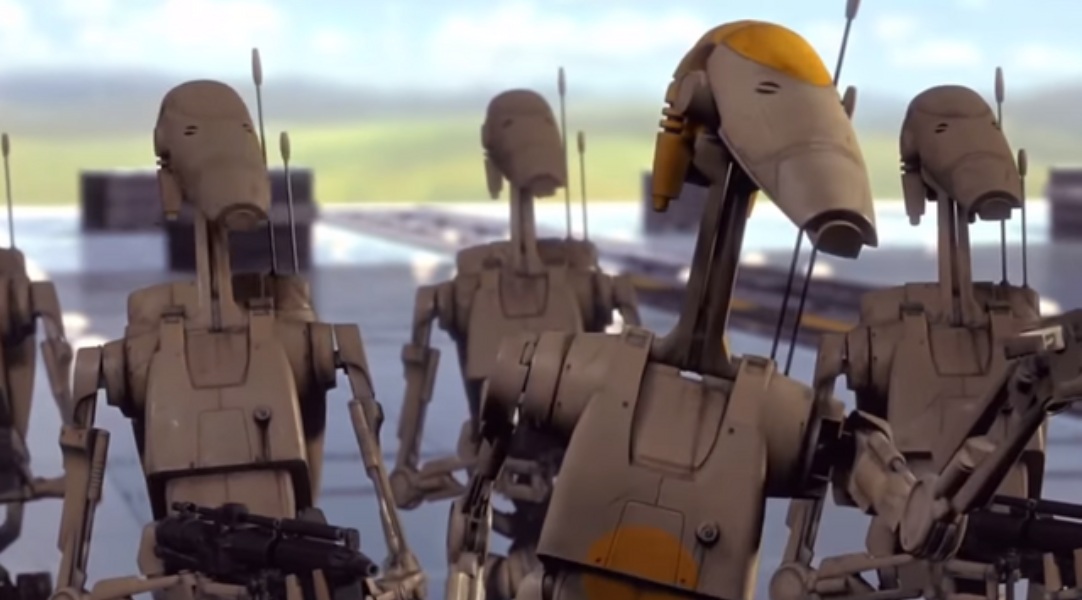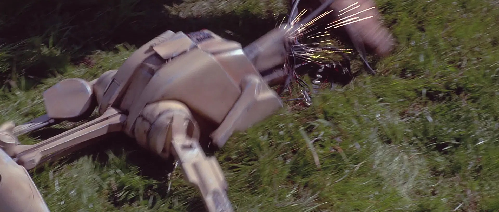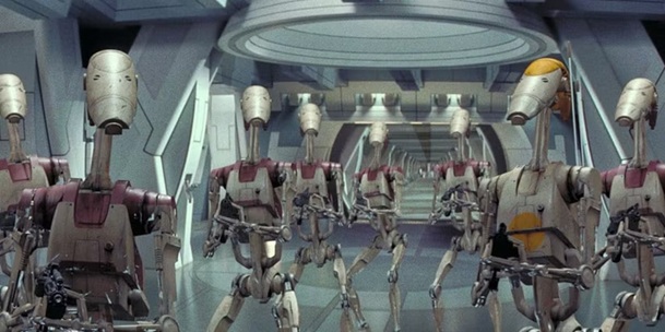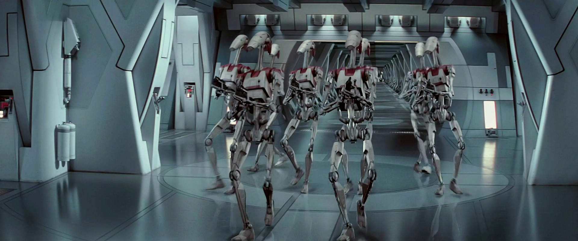 Just compare these two shots of the same scene, and the effect that the slightly cooler lighting of the first has on the droids’ color: