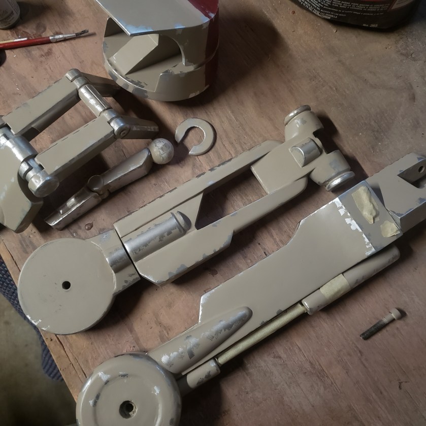 I was all revved up to spray away, but I needed a game plan. My first paintjob was mostly influenced on the physical auction arm, which appeared to use mostly grime and washes for weathering. For the second go-around, however, I wanted to really lean into the onscreen look and the ‘heirloom’ history of this piece, with more physical dings, worn edges, and paint chipping. Instead of trying to spray the whole arm with a metallic layer (because metallics are always fiddly to paint over), after laying on a base coat of the French Beige, I brushed silver enamel on the areas where wear would appear (edges and high spots), extending a little beyond the size of the final chipping.