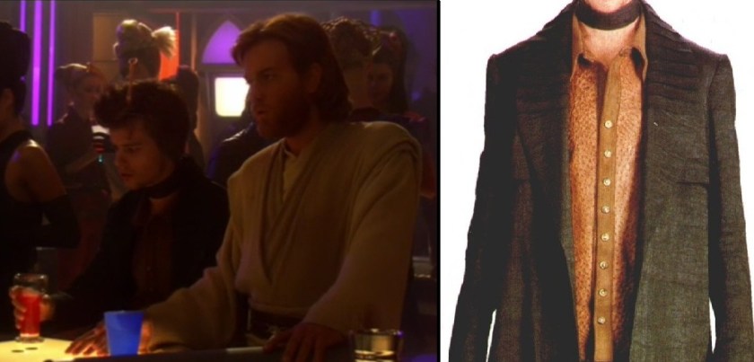 Another Episode II character with lines and a buttoned garment is Balosaur deathstick dealer Elan Sleazebaggano; although the scene is so dark you have to really squint to see the buttons in the film, like the cantina band they’re most visible in posed publicity/reference photos used for the DK Visual Dictionary (where they look suspiciously like the same swirly plastic four-holers found on any random, off-the-rack, modern button-down):