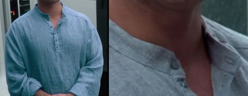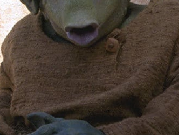 Moving on from Naboo examples, Anakin’s buddy Wald’s tunic has the closest thing to a holed button that we’ve seen yet. Materials-wise it looks pretty crude (are we seeing a slice of wood or antler with a leather thong?) which makes sense socially (he’s extreme downstrata), but also practically: even with that scoop neckline it’s probably tricky to get his Rodian head through, so I imagine this offset collar would give just a little extra room – but you wouldn’t want it flapping around once it was on!)