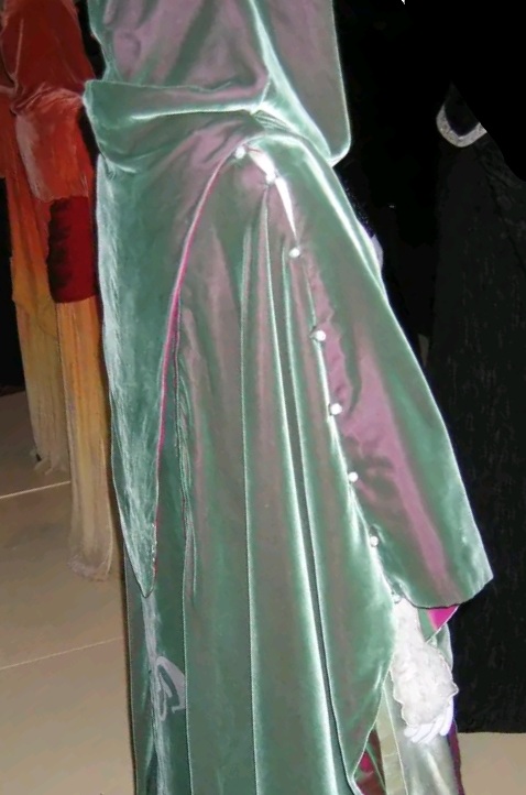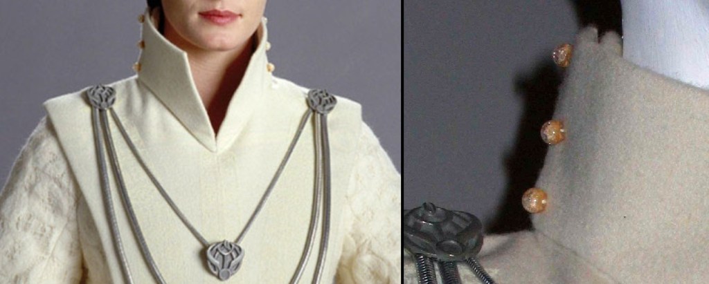 Finally, another member of the Galactic upstrata which really blew my mind when I spotted them: Mon Mothma in Episode III! From the FIDM exhibit, these look to be glass spheres that are (based on what I can see of the overlapping layers) used to fasten her felt mantle’s collar (perhaps just on one side, and they are on both sides for symmetry?)