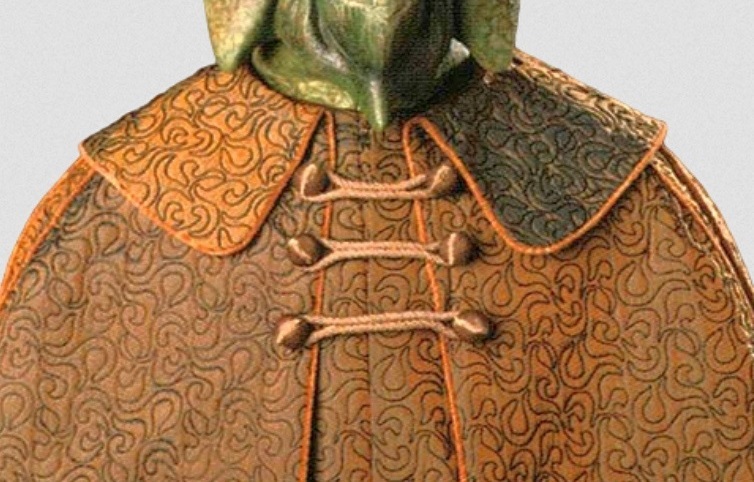 The outfit worn by Ryoo’s grandpa Ruwee (aka Padme’s dad) also includes some sort of button-like device to keep his outer sleeves hitched up – from other views they look like toggles made from knotted fabric. And while not buttons, his tunic also looks like it has buttonholes, part of his curious ribbon-based fastening system: