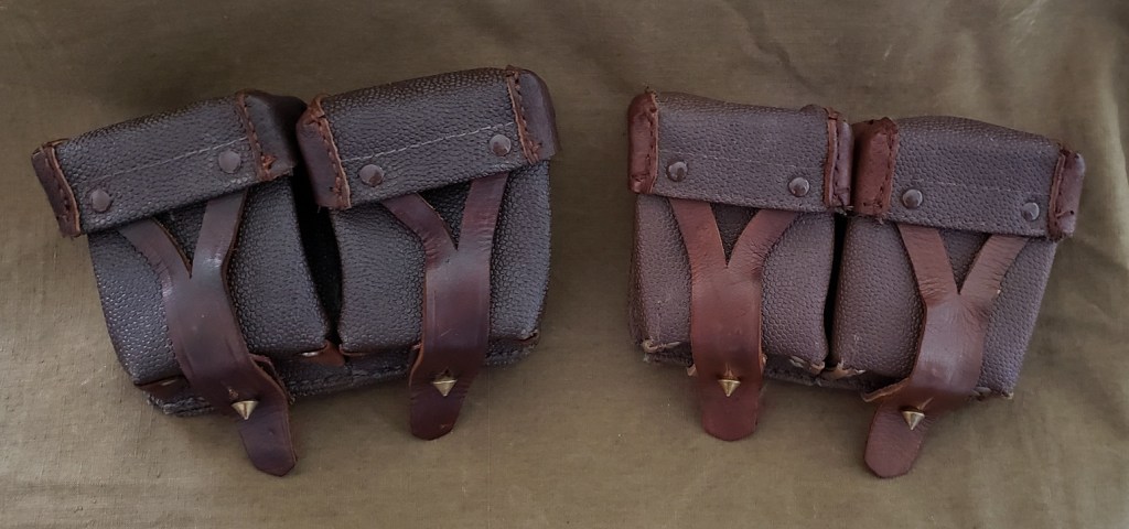 This should come as no surprise, as these postwar pouches are cheap and plentiful (standard double pouches like those above can be had online for $5 or less—and anyone who tries to tell you they’re collectible or valuable is lying). For a piece of starter gear to quickly populate one’s bounty-hunting belt, they’re…fine. The downside to these pouches, however, is that they are immediately recognizable and don’t quite fit the classic Star Wars aesthetic—as the vast majority of holsters, belt pouches, and bandoleers seen in the core six films are all-leather and usually from WWI or WWII. As you can see, postwar Mosin pouches are made of two materials: pebble-textured ‘kirza‘ (which is actually just a rubber-impregnated-canvas), and real grain leather for the corners, rear belt strap, and front closure strap. Because the leather used was almost always lighter in color than the kirza, an eye-catching two-tone effect is created. Thankfully, there is a very easy fix – one which I don’t think many costumers are aware of.