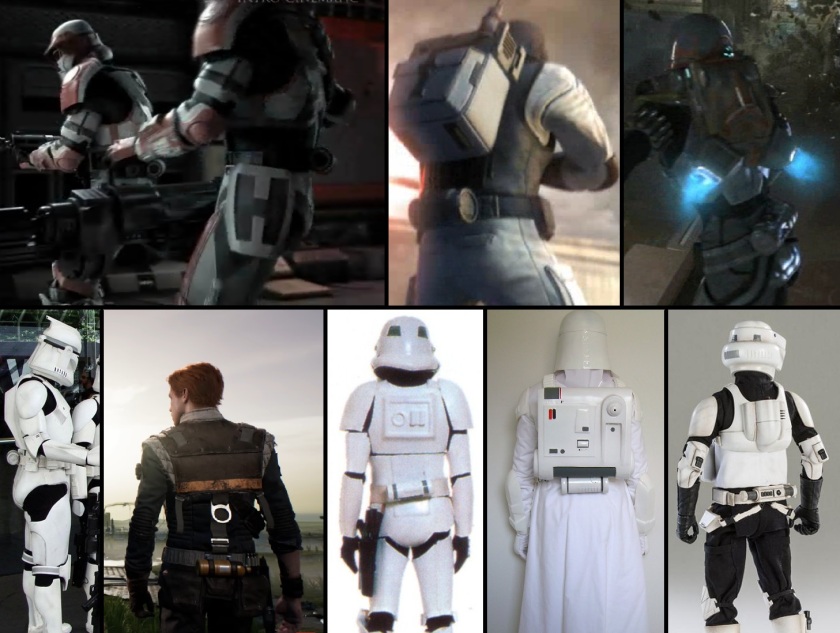 This project in particular is also the result of a curious local quirk: the area of town where I live has a very strong culture of ‘curb crawling’, in that neighbors frequently put unwanted items on their curbs free for the taking! One day last summer I was biking around town when I came upon one of these treasure caches and pulled over to take a look. Among the knick-knacks and a cool bell beaker-shaped glass vase was a plain stainless water bottle (of the sort I had spotted onscreen in Episode II several years back), so I took it home and cleaned it up. The size was actually smaller than the onscreen one – holding only a pint or so – but I thought it might be a useful bit of hydration kit. Since I already have some great in-universe canteens, and this bottle was too small to be a proper canteen, I thought it might be useful for holding some other fluid (electrolyte concentrate? Corellian whisky?), and began brainstorming how I might carry it in a pack or on my person. One way the Star Wars galaxy has always felt like a real setting is the use of repeated visual elements which give a sense of cultural continuity and cohesion. Among my favorite of these is the ubiquitous cylinder carried at the rear of the wearer’s belt: