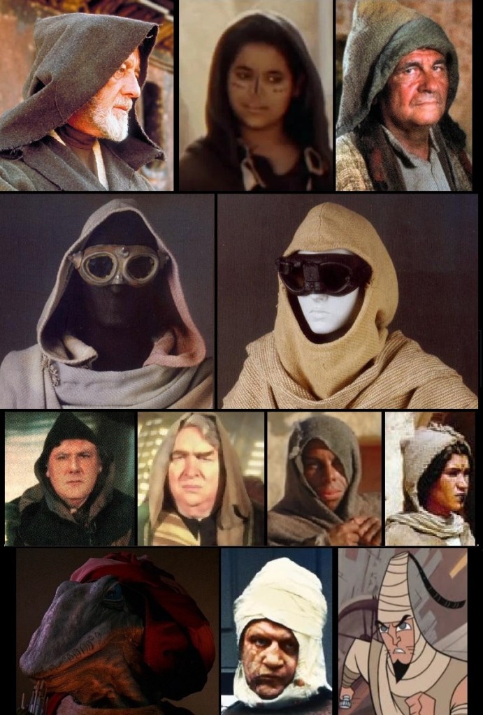 Hoods and wraps: Ben Kenobi, Reike Th’san’s companion, Yade M’rak; Lando and Leia (sandstorm); Murttoc Yine, Thul Fain, Mos espa extras; Melas, Dengar, Tarr Seirr.