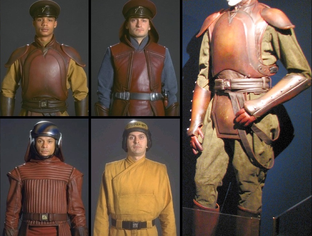 “The Naboo Army personnel in Episode I ranged from officers in the royal household such as Captain Panaka and the palace guards, to footsoldiers, pilots, and air crew. The group had to have an over-all cohesive look, and apart from being aesthetically pleasing—Naboo was a planet of artistic beauty, peace, and tranquility—their clothes need to be functional.”