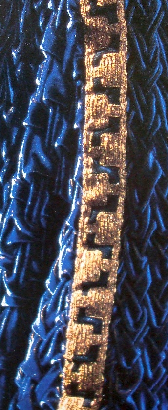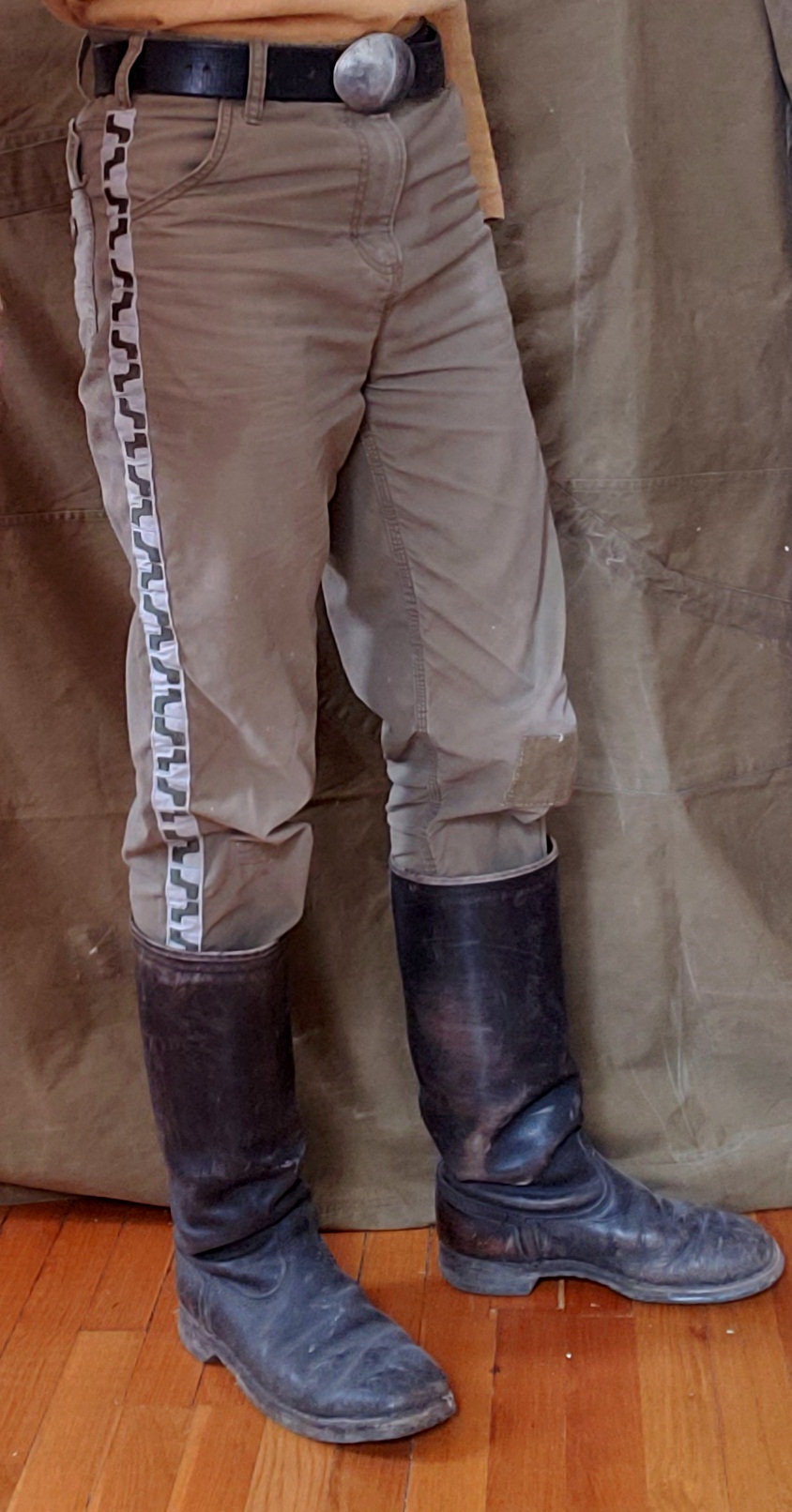 Trousers are (or should!) be the most nondescript part of one’s galactic kit, so in these pictures I’m wearing simple OD high-waisteds, with a conjectural Naboo bloodstripe added down the sides; this pattern comes from the trim of Padme’s Episode II dressing gown: